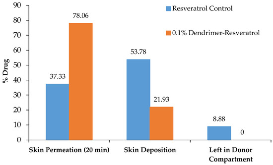 Transdermal permeation studies were conducted using Franz Diffusion Cells (FDC) and rat skin samples. The diffusion cells had a 5 mL receptor chamber and were manufactured by Permegear (Hellertown, PA, USA). The formulations examined were a 0.1% dendrimer-resveratrol formulation, and a control of free resveratrol in water. For each formulation, the receptor chamber of the FDC was filled with 5 mL of a PBS (pH 7.4):methanol 90:10 mixture. Skin samples from Dahl Salt Sensitive rats were cut to size and placed at the interface of the donor and receptor chambers. 0.5 mL of the desired formulation was placed in the donor chamber and the FDC was stirred on a stir plate set to 6 (on an arbitrary 10-point scale). At various intervals over a 24-h period, 400 μL was removed from the receptor chamber by means of the sampling arm and analyzed by HPLC. The volume was replaced by an equal amount of fresh PBS: methanol mixture. After 24 h, an aliquot was taken from the donor chamber and the skin was removed and RSV recovered by soaking skin in 2 mL methanol and sonicating for 10 min followed by filtration and HPLC analysis as discussed before.