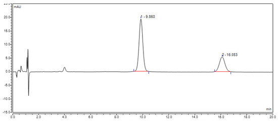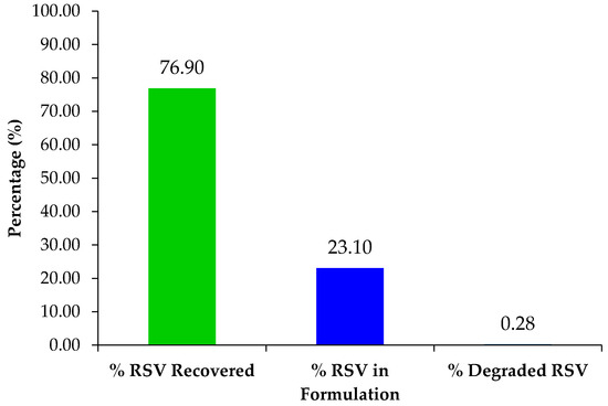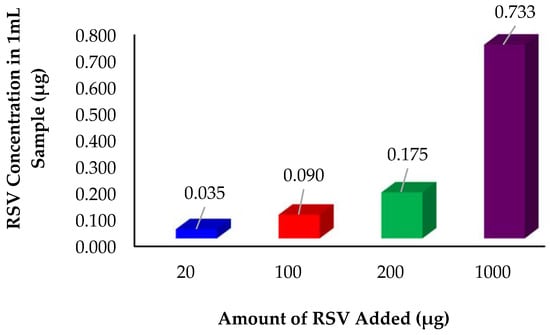 The calibration graph of RSV was prepared in methanol using HPLC. The standard samples were analyzed via a Dionex UltiMate 3000 HPLC (Thermo Scientific, Waltham, MA, USA) using a Luna C18 column (5 μ 100 A Size: 100 × 4.6 mm, Phenomenex, Torrance, CA, USA). Chromeleon software was used to control the UltiMate 3000 and analyze the data generated. The system flow rate was set to 1.0 mL/min and mobile phase ratio was isocratic throughout the run at a 40% methanol: 60% water for a 20-min run period. The diode array detector of the Ultimate 3000 HPLC was set to a wavelength of 308 nm. Injection volumes for the samples were 25.00 µL per sample.