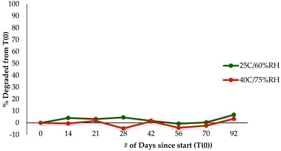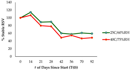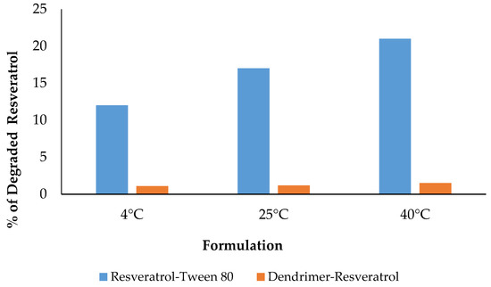 Purpose of the stability testing of RSV in solution was to determine how long RSV is stable in aqueous solution to predict its shelf life expectations. RSV formulations with dendrimer and Tween-80 were prepared along with a control in methanol. Samples were stored at Wisconsin Pharmacal Company (WPC, Jackson, WI, USA) under ICH Q1A conditions in the following temperatures: 4 °C/0% RH, 25 °C ± 2 °C/60% ± 5% RH, 40 °C ± 2 °C/75% ± 5% RH. The samples were collected on the following time points: Day 0, 1, 3, 7, 10, 14, 21, 1 month, and 2 months. The collected samples were measured for RSV content by HPLC. A graph was plotted between percent remaining RSV against time for each temperature point to evaluate stability of the formulations.