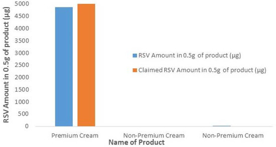 The purpose for conducting this experiment was to test commercial RSV products to see if the claimed amount of resveratrol was present in the products. Each product (0.5 g) was subjected to the developed cream extraction protocol and the RSV content estimated.