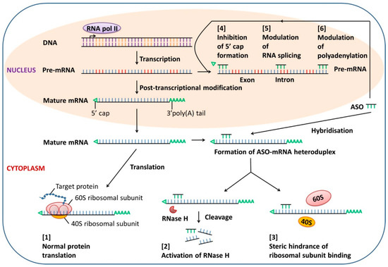 Most ASOs act through RNase H-mediated cleavage of the ASO-targeted mRNA, leading to the degradation of the target mRNA, leaving the ASO intact for re-use. Some ASOs target the 5′ end or AUG initiation codon region of the target mRNA to prevent translation by steric hindrance of ribosomal activity [31]. Other mechanisms of ASO-mediated gene silencing include interference with mRNA maturation such as inhibition of 5′ cap formation, modulation of splicing, and blockade of polyadenylation of pre-mRNA in the nucleus [32] (Figure 1).