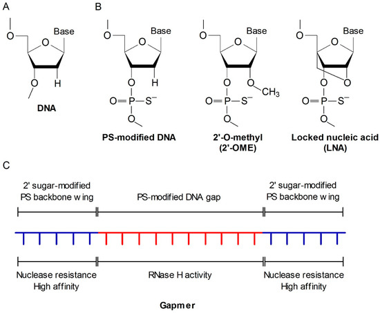 Figure 2. Chemical modifications of ASO. (A) Basic structure of a DNA oligonucleotide; (B) Chemical modifications of ASOs; (C) Structure of a gapmer. The 3rd generation of ASOs are mostly designed with a gapmer structure, typically with 20 nucleotides of phosphorothioate (PS)-modified backbone. The central sequence consists of approximately 10 simple PS-modified DNA residues, referred to as the gap, that can bind RNase H and induce the cleavage of target mRNA. Sugar-modified residues are overhanged on both ends of the gap as protective wings to resist nuclease activity and increase mRNA binding affinity.