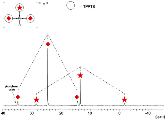 When 1equiv. of RAME-β-CD toward platinum was added to a solution of the [Pt(TPPTS)3Cl]Cl complex, a downfield chemical shift of the TPPTS oxide signal was observed and attributed to the formation of an inclusion complex with RAME-β-CD [19]. Moreover, a typical signal of CD-included TPPTS appeared at −8.8 ppm as well as a cis-PtCl2(TPPTS)2 signal at 15.5 ppm (Figure 6).