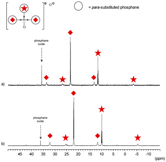 31P{1H} NMR spectra of (a) [Pt(tris(p-Me)TPPTS)3Cl]Cl and (b) [Pt(tris(p-OMe)TPPTS)3Cl]Cl, [Pt] = 10 mM, 25 °C in D2O.