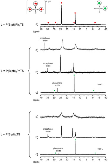 Again, [PtL3Cl]Cl complex was obtained by adding three equivalents of the monobiphenyl ligand P(Biph)Ph2TS to a K2PtCl4 aqueous solution. However, when P(Biph)2PhTS and P(Biph)3TS were used, the complexes appeared as broad signals in the 31P{1H} NMR spectra. Addition of DMSO to the previous aqueous solutions achieves finer signals (Figure 5).