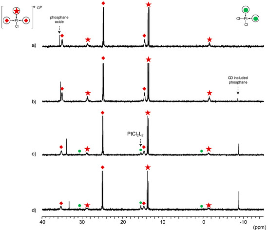 On the other hand, when P(Biph)2PhTS and P(Biph)3TS were used, addition of large amounts of CD to the complexes synthetized by adding three equivalents of the previous ligands to a K2PtCl4 aqueous solution did not lead to a signal improvement (obtained spectra were comparable to those presented in Figure 5(a)), so in these cases, it is difficult to conclude.