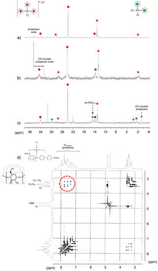 Furthermore, intense cross-peaks between the CD internal H3 protons and Ha of the biphenyl moiety together with high correlations between the CD internal H5 protons and Hc/Hd of the biphenyl moiety in the T-ROESY spectrum allow us to propose a geometry where the phosphane penetration in the CD cavity takes place via the primary face (Scheme 5).
