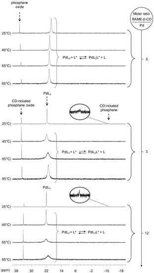 As already described [16], the ligand P(Biph)3TS forms a new palladium species at room temperature:PdL4 which have a chemical shift of 15 ppm. Without CD, PdL3 and PdL4 species are in slow equilibrium. Indeed, when the temperature is increased, the signals of both complexes are broadened and merge together at 85 °C (Figure 13). Moreover, the NMR spectrum carried out at room temperature after heating gave the same signals reflecting the reversibility of the process.
