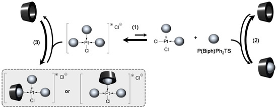 Phosphanes possessing one, two or three sulfonated biphenyl groups strongly interact with the β-CD. Indeed, complexation studies between these ligands and native β-CD showed a deep inclusion of their biphenyl moiety in the CD cavity. In all cases, stoichiometries were determined to be equal to 1:1 and association constants were particularly high (Table 1 and Supplementary Materials). Consequently, the influence of such association towards the platinum organometallic complexes was investigated.
