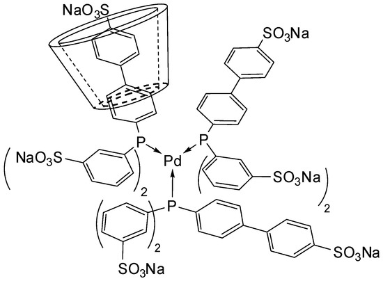 However, the combination of a palladium precursor with a water-soluble triphenylphosphane derivative possessing a p-tert-butylbiphenyl group led to the formation of a stable second-sphere coordination adduct where the CD encapsulated the ligand directly bounded to the metal centre [13]. Such species had already been observed with a phosphane bearing adamantyl groups [14].