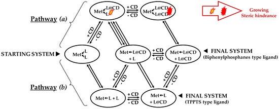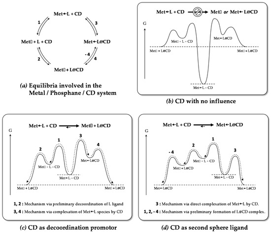 Basically, by considering a simplified system consisting of a cyclodextrin (CD) and a phosphane (L ligand) coordinated to a metal (Met), i.e., a “Met ← L + CD” system, several evolutions are possible. Firstly, the phosphane can naturally leave the metal by decoordination and lead to a “Met⌷ + L + CD” system (Scheme 7a, 1). This last system can then be transformed by inclusion of the free ligand in the CD cavity (Scheme 7a, 2). Starting from the same initial system (“Met ← L + CD”), another evolution can be the complexation of ligand bound to the metal to reach a “Met ← L@CD” system in which the CD acts as a second sphere ligand (Scheme 7a, 3). In this complex, the “L@CD” part constitutes a supramolecular ligand which can therefore also leave the metal to lead to a “Met⌷ + L@CD” system (Scheme 7a, 4). The fore-mentioned systems are in equilibrium and their proportions are consequently driven by their free enthalpy, the more stable system being the more represented one.