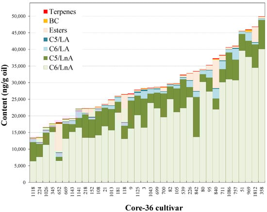 Pearson’s correlation coefficients were calculated in order to study the relationship between the main groups of volatile compounds found in the oils from the Core-36 cultivar collection (Table S1 in Supplementary Materials). As expected, the total content of volatile compounds in the oils correlated significantly with the major group of volatile compounds in the oils (C6). Particularly remarkable is the strong and very significant correlation with the C6/LnA aldehydes (r = 0.91). On the contrary, the rest of the C6 groups showed a significant, but moderate, correlation (r = 0.35, 0.46, and 0.32). By contrast, most of the C5 compounds displayed a low correlation coefficient except for the pentene dimers that carried a moderate level of correlation (r = 0.38) with total volatiles. Esters and BC compounds displayed no correlation with the total oil volatile compound contents. These data are in good agreement to those found for the oils of the segregating population of the Picual × Arbequina cross [30], except for the fact that the relationship of the C5 compounds with total volatiles was moderate to high in the latter. A conceivable explanation might be that the parents of the cross, Picual and Arbequina, are cultivars whose oils contain average to high contents of C5 compounds compared to the rest of the Core-36 cultivars.