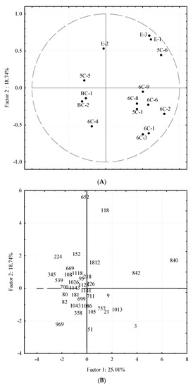 C6 alcohols derived from both LA and LnA clustered along the PC2 negative axis clearly distanced from the rest of compounds synthesized by the LOX pathway (Figure 2). The distance in the plot from their precursors in the LOX pathway could be explained by the weak correlation displayed by these groups of compounds mentioned above, probable consequence of ADH inactivation during the oil extraction process [33]. The esters clustered along the PC2 negative axis, overlapping the space of their metabolic precursors synthesized through the LOX pathway, which suggests that, on average, cultivars from the Core-36 collection seem not to have limited AAT activity and that only the limitation of ADH activity during the oil extraction process would be responsible for the moderate correlation between esters and the C6 alcohols (Table S1 in Supplementary Materials). The BC compounds clustered away from the rest of compounds were synthetized by the LOX pathway, indicative of a different metabolic origin.