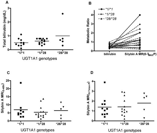 Bilirubin concentrations and silybin A metabolic ratios in different UGT1A1 promoter genotype groups. (A) Total bilirubin concentration in hepatitis C virus (HCV) and nonalcoholic fatty liver disease (NAFLD) patients with different UGT1A1 genotypes; (B) Relationship between silybin A (SA) metabolic ratio (MR) (0-Tmax-P) and ratio of conjugated bilirubin to total bilirubin; (C,D) SA MR (0–48 h) and MR (0-Tmax-P) with different UGT1A1 genotypes.