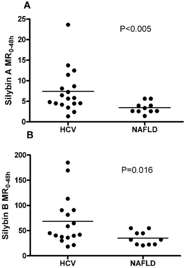 Silybin (A,B) metabolic ratio (MR) stratified by liver disease type. Mean MR in patients with HCV infection and NAFLD were 7.4 and 4.5 for SA (p < 0.005), and 68.6 and 43.4 for silybin B (SB) (p = 0.016), respectively, using student’s t-test.