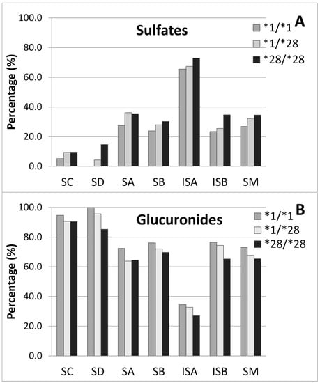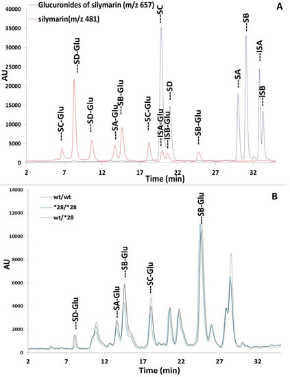 Thus, there were no significant differences in the metabolites profiles of patients’ plasma with different UGT1A1 genotypes (Figure 3B) as well as the conjugation rate of sulfates or glucuronides of each flavonolignan (Figure 5). Consequently, UGT1A1 polymorphisms do not appear to affect the metabolism of silymarin flavonolignans in patients with HCV or NAFLD.