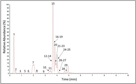 | 13 | 577.1340 | 3.56 | 260, 370 | C30H26O12 | 1.8 | 451, 425, 407, 289 | B-type Procyanidin |