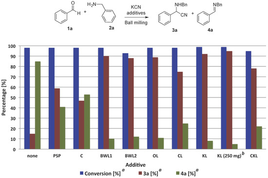 Conversion and selectivity of the mechanochemical Strecker reaction using biomass-derived additives. Reaction conditions: unless otherwise stated, 1a (53.1 mg, 0.5 mmol), 2a (53.6 mg, 0.5 mmol), KCN (35.8 mg, 0.55 mmol), and the additive (200 mg) were milled in a mixer mill for 2 h at 30 Hz using a stainless steel milling jar of 10 mL and one milling ball of the same material 10 mm in diameter. a Determined by 1H-NMR spectroscopy; b 3 h of milling. PSP = peanut shell powder; C = cellulose; BWL1 = beechwood lignin 1; BWL2 = beechwood lignin 2; OL = oak lignin; CL = cherry lignin; KL = Kraft lignin; CKL = capped Kraft lignin.