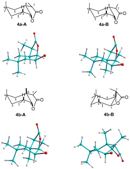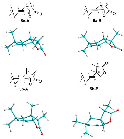 The only difference is the presence of a double bond between carbons C-2 and C-3. The signals of the H-2 and H-3 protons, which look like wide multiplets for lactone 5a, suggests their axial orientation. In the case of lactone 5b, the coupling constant between protons H-2 and H-3 is 10.2 Hz (for 5b-A) and 10.0 Hz (for 5b-B), also indicating their axial position (Figure 2).