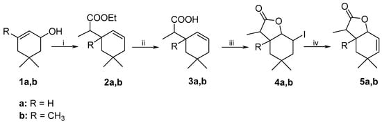 Synthesis of lactones 5a and 5b. Reagents and Conditions: (i): CH3CH2C(OC2H5)3, CH3CH2COOH, 137 °C (2a: 84%, 2b: 82%); (ii): KOH, EtOH, 100 °C (3a: 96%, 3b: 92%); (iii): I2, KI r.t. (4a: 71%, 4b: 75%); (iv): DBU, toluene, 110 °C (5a: 79%,5b: 79%).