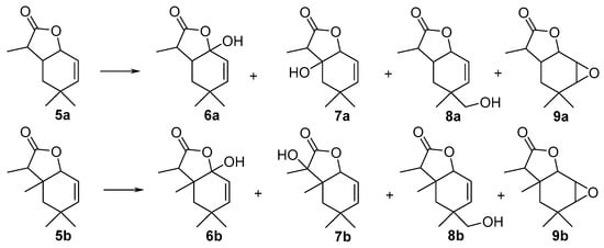 Analysis of the 1H-NMR spectra of all obtained products proved that the microorganisms used here preferred hydroxylation of the tertiary carbons present in the molecules of both substrates. All three fungal strains converted substrate 5a into hydroxylactone 7a, in which the hydroxy group attacks the tertiary C-6 carbon. A comparison of the 1H-NMR spectra of the substrate with the product concluded that this product was created only from isomer B of the substrate. This result was very surprising because until now such a hydroxylation position was not observed in similar compounds. The S. racemosum strain was able to introduce the hydroxy group in an allylic position (the tertiary C-1 carbon) giving product 6a as a pair of diastereoisomers, whereas in the case of the P. vermiculatum strain, the product 8a in which the hydroxy group is introduced into the CH3-10 group was obtained. This compound was created only from isomer B of the substrate. The A. cylindrospora strain gave one other product—the epoxylactone 9a—as a pair of diastereoisomers. The small coupling constants between protons H-1, H-2 and H-3 (about 3.0 Hz) in epoxylactone 9a indicate that these protons are in equatorial positions. This observation also indicates that the epoxide ring is introduced trans relative to the lactone ring.