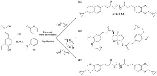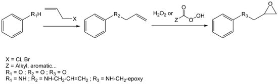 - Aouf, C.; le Guerneve, C.; Caillol, S.; Fulcrand, H. Study of the O-glycidylation of natural phenolic compounds. The relationship between the phenolic structure and the reaction mechanism. Tetrahedron 2013, 69, 1345–1353. [Google Scholar] [CrossRef]