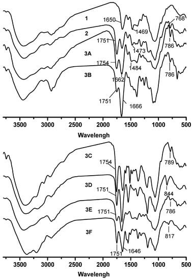Each step of the synthesis was verified by FT-IR and 13C-NMR spectroscopy analyses. The FT-IR and 13C-NMR spectra of intermediate products, compounds 3A–3F, are shown in Figure 1 and Figure 2 respectively. In the FT-IR spectrum of compound 1, a new peak at 1469 cm−1 was ascribed to the characteristic absorption of N-CH3 []. In the 13C-NMR spectrum of compound 1 (Figure 2), the carbon of N-CH3 is clearly observed at 53.4 ppm. For compound 2, the reaction of chloracetyl chloride with quaternary ammonium chitosan led to a new peak at 1751 cm−1, which could be attributed to carbonyl (C=O) []. Meanwhile, another new peak at 768 cm−1 was assigned to the C-Cl group []. In the 13C-NMR spectrum of compound 2, the stretching vibration of the carbonyl group C=O at 167.9 ppm and that of quaternary ammonium at 53.8 ppm can be clearly observed (Figure 2). All of these characteristic peaks indicated that chloracetyl quaternary ammonium chitosan (compound 2) was synthesized successfully.