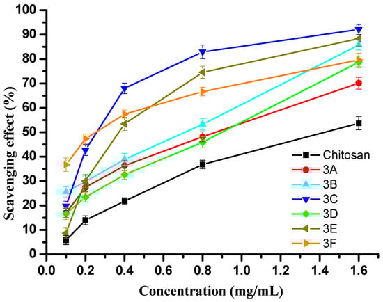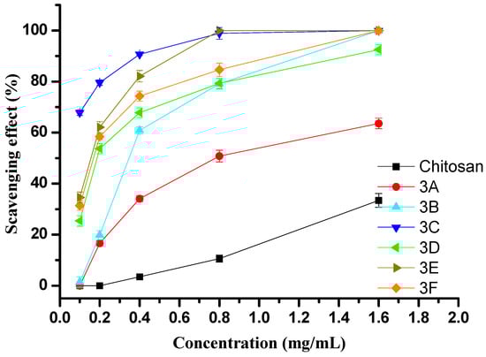Figure 3 and Figure 4 reveal the hydroxyl-radical scavenging ability and DPPH-radical scavenging ability of chitosan and compounds 3A–3F at various concentrations, and the antioxidant activity results are shown in Table S1 as Supplementary Materials. As seen in Figure 3, the hydroxyl-radical scavenging ability of chitosan is weak, and compounds 3A–3F give much stronger hydroxyl-radical scavenging ability compared with chitosan. Besides, the scavenging effect of all the samples mounts up with increasing concentration. It is obvious that compounds 3A–3F show much better antioxidant activity due to the introduction of pyridine groups. Furthermore, it is apparent that compounds 3B–3F, which have amino group at the periphery of molecular chains, have better hydroxyl-radical scavenging ability. This is possibly because of the presence of the more exposed amino group. The results above are in accord with the conclusion that aminated derivatives of saccharide are more potent than natural saccharide as a scavenger of hydroxyl radicals [,,]. The scavenging property of chitosan and compounds 3A–3F against DPPH-radical is shown in Figure 4. Similar to hydroxyl-radical scavenging ability, these compounds also possess more remarkable antioxidant activity, compared with chitosan. Furthermore, compounds 3B–3F show better antioxidant activity at most concentrations. The antioxidant capacity observed in this experiment is consistent with the conclusion that amino groups can increase antioxidant activities []. Moreover, the results further confirm that the pyridine group and amino group grafted into compounds 3A–3F contribute a lot to the antioxidant action and consequently increase the antioxidant activity of them.
