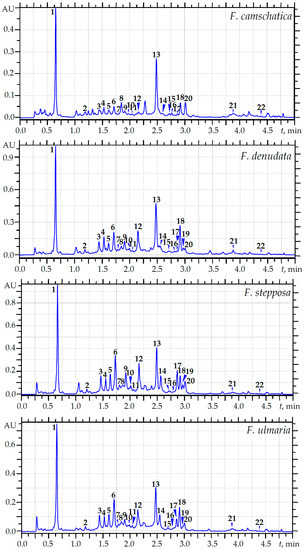 Speculating about the possible reasons for these results, it can be concluded that F. ulmaria, F. denudata and F. stepposa are relate to the same subgenus Ulmaria of the Filipendula genus, while F. camschatica belong to the subgenus Aceraria. Due to their high content of flavonoids and ellagitannins, F. denudata and F. stepposa may be considered as promising substitutes for the officinal species F. ulmaria.