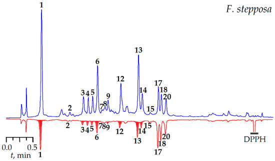 A preliminary characterization of antioxidant potential was carried out using the DPPH-MC-RP-HPLC-UV procedure, involving HPLC separation of samples pre-treated with an excess of DPPH•, followed by comparison with the HPLC chromatogram of an untreated sample. The reaction between an antioxidant and radical results in the oxidation of the antioxidant, which leads to a decrease in the corresponding peak areas in the chromatograms. The comparison of the HPLC chromatograms of untreated and radical-treated samples allows for the determination of the most active compounds. The chromatograms of the F. stepposa tea decoction spiked with DPPH• radicals are shown in Figure 3, and present obviously reduced peak areas for some compounds in comparison with untreated samples.