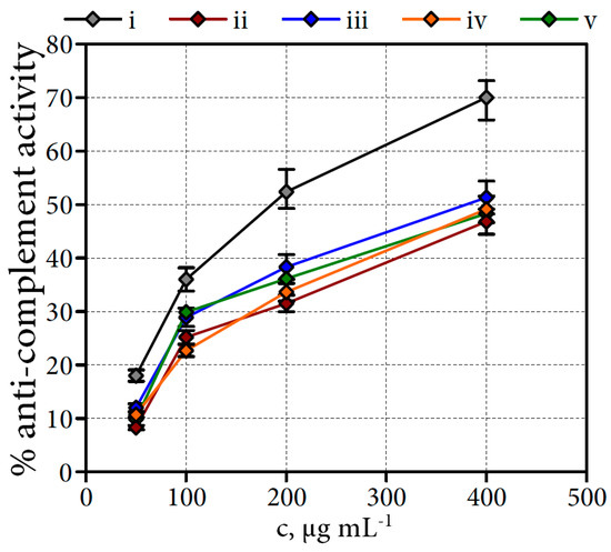 Anti-complement activity of crude water-soluble polysaccharide fractions (WSPS) from four meadowsweet floral teas. Samples: i—polysaccharide MPP′-2 from Mentha piperita (positive control); ii—WSPS from F. camschatica flowers; iii—WSPS from F. denudata flowers; iv—WSPS from F. stepposa flowers; v—WSPS from F. ulmaria flowers.