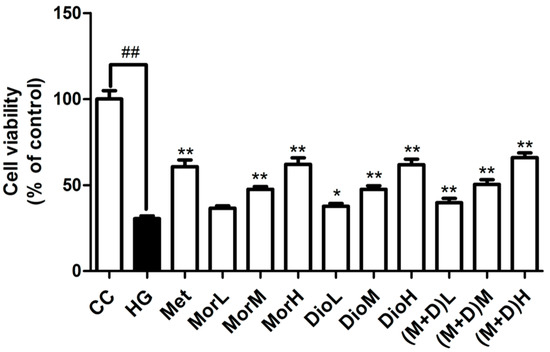 Effects of Mor (25, 50, 100 μg/mL), Dio (25, 50, 100 μg/mL), and M + D (25, 50, 100 μg/mL) on rat cardiomyocyte viability under HG-induced cell injury after pretreated 72 h. Values are expressed as the mean ± SD. ## p < 0.01 vs. CC; ** p < 0.01, * p < 0.05 vs. HG.