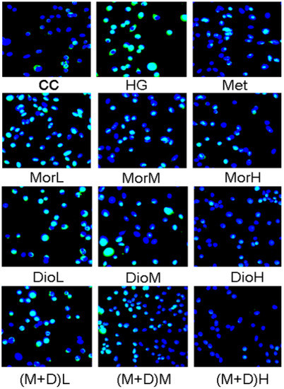 Apoptosis assay was measured with TUNEL staining. Cells with green nuclei were considered apoptotic, and our results revealed that few cells with nuclei stained green were observed in the (M + D)H group (Figure 2). After being exposed to HG for 48 h, compared with the CC group, the total cell numbers were significantly reduced, and approximately 91.53% of cells showed apoptotic hallmarks. Compared with the HG group, (M + D)H significantly reduced the percentage of apoptotic cells to 24.59% (p < 0.01, Figure 2), so that the total cell numbers were significantly increased. It was found that Mor, Dio, and M + D could reduce apoptosis of cells to varying degrees. Based on the comparison, (M + D)H was more effective than MorH and DioH in inhibiting apoptosis of cardiomyocytes under hyperglycemic conditions.