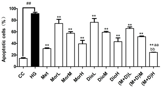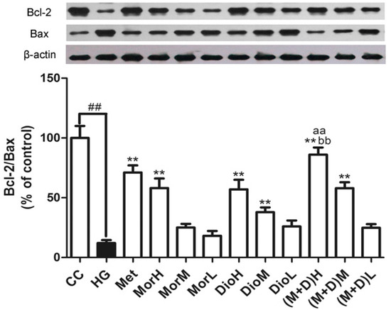 Regulation of proteins Bcl-2 and Bax associated with apoptosis by MorH, DioH, and (M + D)H. Data are expressed as mean ± SD. ## p < 0.01 vs. CC; ** p < 0.01, vs. HG; aa p < 0.01, vs. MorH; bb p < 0.01, vs. DioH.