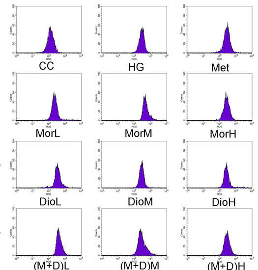 The molecular probe DCFH-DA was used to label peroxide in cardiomyocytes. After DCFH-DA, the results revealed that the ROS levels of the HG group were increased to 735.00 ± 12.82% as compared to the control level (263.75 ± 5.24%, p < 0.01), yet pretreatment of the cells with (M + D)H (342.51 ± 31.40%) markedly reduced the ROS levels compared with MorH (434.50 ± 10.14%), DioH (524.57 ± 5.73%), and Met (p < 0.01 Figure 3). There was no significant difference between Mor or Dio and HG group. Therefore, it was concluded that the cardioprotective effect of M + D was significant and enhanced its antioxidant effect.