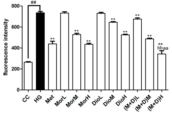 (M + D)H protects cardiomyocytes from mitochondrial production ROS induced with HG as determined with DCFH staining. Data are expressed as mean ± SD. ## p < 0.01 vs. CC; ** p < 0.01, vs. HG; aa p < 0.01, vs. MorH; bb p < 0.01, vs. DioH.