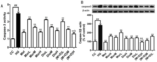 (A) Effect of (M + D)H on caspase-3 activity by using a colorimetric activity assay kit. Data are expressed as mean ± SD. ## p < 0.01 vs. CC; ** p < 0.01 vs. HG; aa p < 0.01, vs. MorH; b p < 0.05 vs. DioH; and (B) the effect of (M + D)H on the expression levels of caspase-3 protein of cardiomyocytes after HG injury. Data are expressed as mean ± SD. ## p < 0.01 vs. CC; ** p < 0.01 vs. HG; aa p < 0.01, vs. MorH; b p < 0.05 vs. DioH.