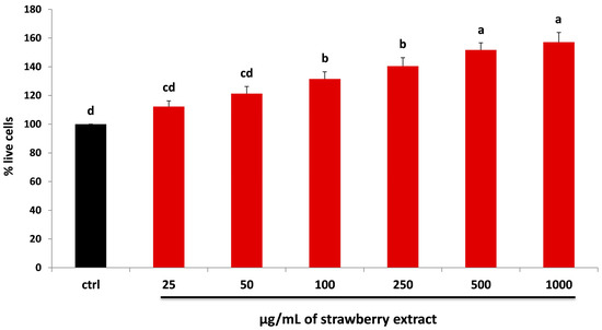 First, HDF cells were incubated for 24 h with different concentrations of dried strawberry extracts in order to evaluate their possible cytotoxic effect. After the treatment, an increase in cell viability was observed in a dose-dependent manner, up to +57% with 1000 µg/mL of strawberry extract (p < 0.05) (Figure 1). These results are in line with previous studies which highlighted the anti-cytotoxic effect of strawberry treatment on cellular viability [26,27,29].