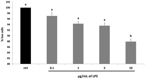 MTT assay for the determination of cell viability in HDF cells treated with different concentrations of LPS (0.1–10 µg/mL) for 24 h (grey bars). Black bar represents the control group. Data are expressed as mean values ± SD. Values with different superscript letters are significantly different (p < 0.05).