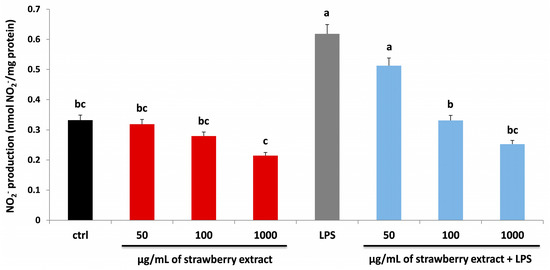 NO2− production in HDF cells treated with different concentrations of strawberry extracts (50, 100, 1000 µg/mL) for 24 h (red bars), LPS (10 µg/mL) for 24 h (grey bar) and with different concentrations of strawberry extracts and then with LPS (blue bars). Black bar represents the control group. Data are expressed as mean values ± SD. Columns with different superscript letters are significantly different (p < 0.05).