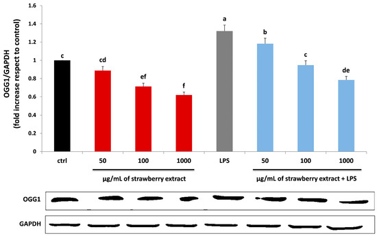 Level of protein related to DNA damage (OGG1) in HDF cells treated with different concentrations of strawberry extracts (50, 100, 1000 µg/mL) for 24 h (red bars), LPS (10 µg/mL) for 24 h (grey bar) and with different concentrations of strawberry extracts and then with LPS (blue bars). Black bar represent the control group. Data are expressed as mean values ± SD. Columns with different superscript letters are significantly different (p < 0.05).