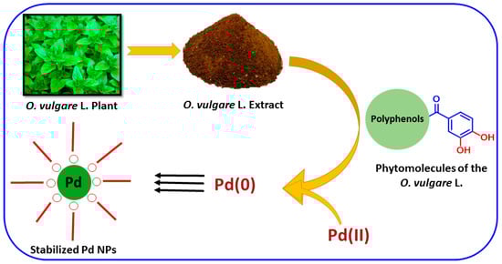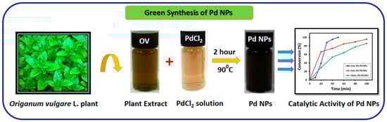 Pd NPs have been investigated as the most effective reagent for numerous conversion reactions like Suzuki, Stille, and Heck coupling reactions [31,32,33]. As the catalytic performance of Pd NPs is reliant on the shape and size for its performance as a catalyst. In the current study (as shown in Figure 1), we describe a facile and environmentally-friendly technique for the preparation of Pd NPs using an aqueous extract of aerial parts of Origanum vulgare L. (OV) as a bioreductant. Moreover, the phytomolecules present in O. vulgare L. extract are not only accountable for the reduction and progression of nanoparticles, but they were also found to perform as stabilizing agents, which was confirmed by various characterization techniques. The as-synthesized metallic Pd NPs were mainly characterized using ultraviolet-visible spectroscopy (UV-Vis), X-ray diffraction (XRD), transmission electron microscopy (TEM), energy-dispersive X-ray spectroscopy (EDX), thermal gravimetric analysis (TGA), and Fourier-transform infrared spectroscopy (FT-IR). Furthermore, the green synthesized metallic Pd NPs were investigated for application as a catalyst for selective oxidation of alcohols.