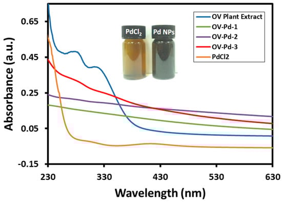 Ultraviolet-visible (UV-Vis) absorption spectra of pure O. vulgare L. extract (blue line), PdCl2 (orange line), OV-Pd-1 (green line), OV-Pd-2 (purple line), and OV-Pd-3 (red line).