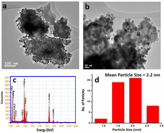 From TEM images, it can be seen that OV-Pd NPs agglomerated to each other and the size of the Pd NPs increases. The elemental composition of as-prepared OV-Pd NPs was examined via energy-dispersive X-ray spectroscopy, Figure 4c. The existence of Pd is evidently designated in the spectrum, composed with other elements comprising carbon and oxygen. This also designates the existence of residual organic compounds of the O. vulgare L. extract acting as capping ligands on the surfaces of the OV-Pd NPs. The nano-range and particle size distributions calculated from the image show that the mean particle sizes were 2.2 nm, as shown in Figure 4d. In this case, a narrow particle size distribution was obtained as expected when the capping method was used for preparation.