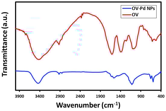 Fourier transform-infrared spectra of as-synthesized palladium nanoparticles (OV-Pd NPs, blue line) and the O. vulgare L. extract (red line).