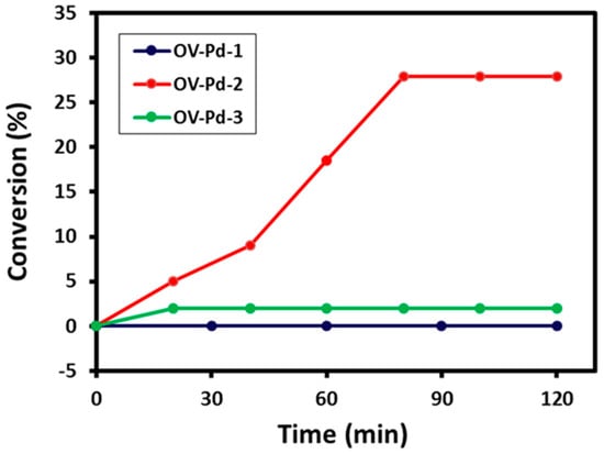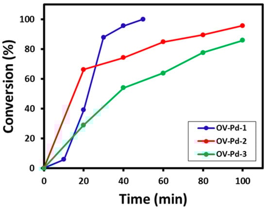 Graphical illustration of conversion vs. t reaction time for aromatic alcohol oxidation employing OV-Pd-1, OV-Pd-2, and OV-Pd-3.