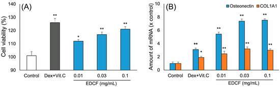 The osteoblasts were directly isolated from the calvarias of postnatal day 1 rats. The osteoblasts were able to undergo differentiation induced by dexamethasone and vitamin C. The methylthiazole tetrazolium (MTT) method was used to observe the effect of ECDF on the proliferation of osteoblasts. As shown in Figure 1A, the proliferation of osteoblasts was up to 112%, 117%, and 121% following incubation with EDCF at 0.01, 0.03, and 0.1 mg/mL, respectively. The EDCF-induced osteoblast differentiation was further confirmed by activation of osteonectin and type I collagen (COL1A1) mRNA levels. Using quantitative real-time polymerase chain reaction (PCR), the levels of these differentiation markers increased significantly following treatment with dexamethasone and vitamin C (p < 0.05; p < 0.01). The levels of COL1A1 and osteonectin increased by more than 2.4-fold and 5.4-fold after treatment with EDCF (p < 0.05; p < 0.01), respectively.