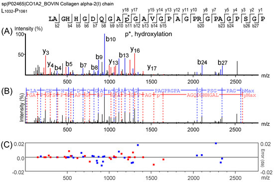 Nano-LC MS/MS-based peptide identification has made peptide analysis in highly complex mixtures feasible. In the present study, taking the peptide LAGHHGDQGAPGAVGPAGPRGPAGPSGPAG as an example, high energy collision dissociation (HCD) was optimized to obtain b and y ion series (Table S1, Figure 2A,B) and the error of these ions was lower than 0.02 Da (Figure 2C). These ions were then searched against the Pecora database, and the amino acid sequence was confirmed. As shown in Figure 2A, it could be confirmed that this peptide matched with collagen α-2(I) based on the database searching. As a result, a total of 272 peptides were identified in the EDCF, and the parent proteins of these peptides were collagens. It was confirmed that these peptides were hydrolyzed from these three parent proteins (unique peptides ≥ 2), collagen α-1 (W5P481) and collagen α-2 (W5NTT7 and P02465).