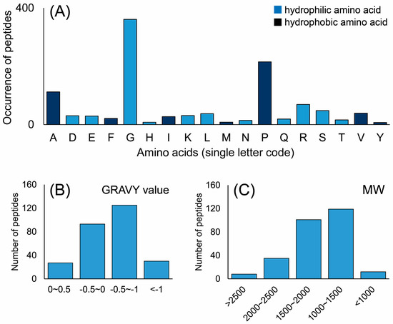 (A) Occurrence of the amino acids in all identified peptides; (B) Grand average of hydropathicity (GRAVY) index value of the identified peptides. GRAVY index values lower than 0 represent that the peptides possess hydrophilic properties; (C) Molecular weight (MW) distribution of the identified peptides. All of the value based on the total number of peptides.