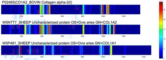In the present study, a comprehensive analysis of the peptides was used to obtain information on the presence of peptides and the mode of peptide formation in EDCF. Primary sequences of peptides showed that most of these peptides originated from collagens, as shown in the Supplemental Data Figure S1, Figure S2 and Figure 4. MS/MS spectra of peptides were set up to search the Pecora database which contains 94,259 proteins (the Pecora are an infraorder of even-toed hoofed mammals with ruminant digestion, including deer). As a result, there are two parent proteins from which these peptides origin, collagen α-1 (W5P481) and collagen α-2 (W5NTT7 and P02465). It may be helpful to explain what happened to the EDC proteins during the aqueous extraction process. The regions which release peptides are not evenly distributed in the total protein sequences. In order to understand the locations of identified peptides, the number of times single amino acids made up the peptides in the primary sequence of proteins was counted and reported as a protein heat map. Heat maps of peptide distribution indicated the locations of highest hydrolysis of each protein, which graphically displayed the occurrence of the different amino acids in the primary sequence of the parent protein. In heat maps, as shown in Figure 4, there are particular “hot regions” in the amino acid sequence which might undergo proteolysis easily and generate peptides [16]. Blue regions indicate low occurrence, red regions indicate frequently appearing residues. In the primary sequence of proteins, each position only has one amino acid, and there were various hydrolyzed peptides which might be derived from the same protein fragment. Therefore, in the heat map, amino acids in each position would appear not only once. In contrast, there are also some amino acid sequences which do not undergo hydrolysis easily. As shown in Figure 4, according to the heat map profiles, three proteins showed different releasing types. Two types of collagen α-2(I) showed a similar profile (Figure 4).